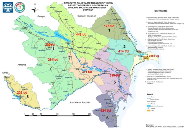 - Waste generation distribution is mapped for all Azerbaijan. Using this information, the quantity of waste within each rayon, i.e., rayon wastesheds, and regional waste sheds are mapped. See a sample map for regions that aggregate wastes into potential zones of about 300 tons/day, which is generally considered the minimum quantity needed to achieve economies-of-scale in a sanitary landfill facility.